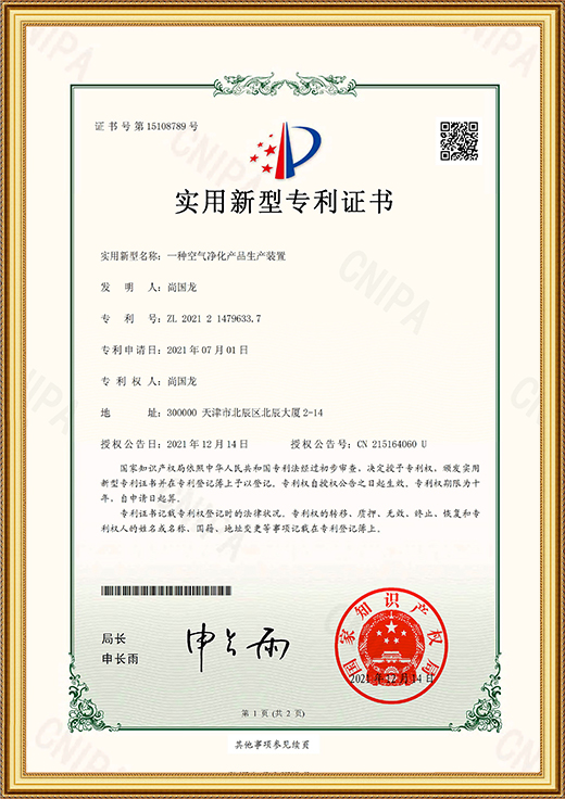 • 實用新型專利證書(一種空氣凈化產(chǎn)品生產(chǎn)裝置